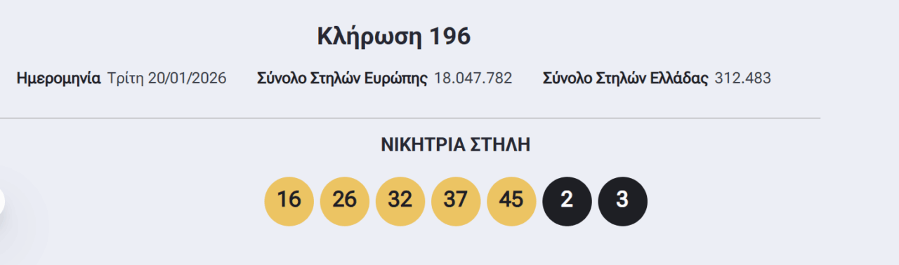 Οι τυχεροί αριθμοί που ανέδειξε η κλήρωση του Eurojackpot το βράδυ της Τρίτης, 20/1/2026 είναι οι εξής: 16, 26, 32, 37, 45 και 2, 3.