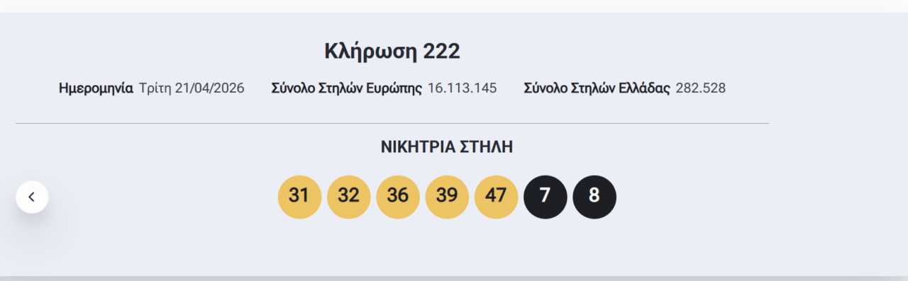 Οι τυχεροί αριθμοί που ανέδειξε η κλήρωση του Eurojackpot το βράδυ της Τρίτης, 21/4/2026 είναι οι εξής: 31, 32, 36, 39, 47 και 7, 8.