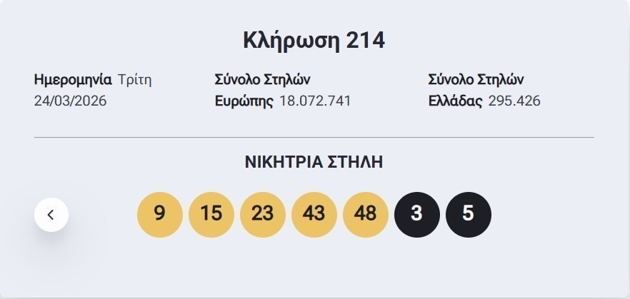 Οι τυχεροί αριθμοί που ανέδειξε η κλήρωση του Eurojackpot το βράδυ της Τρίτης, 24/3/2026 είναι οι εξής: 9, 5, 23, 43, 48 και 3, 5.