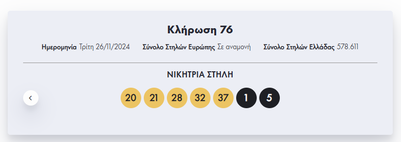 Οι τυχεροί αριθμοί που ανέδειξε η κλήρωση του Eurojackpot το βράδυ της Τρίτης 26/11/2024 είναι οι εξής: 20, 21, 28, 32, 37, 1, 5