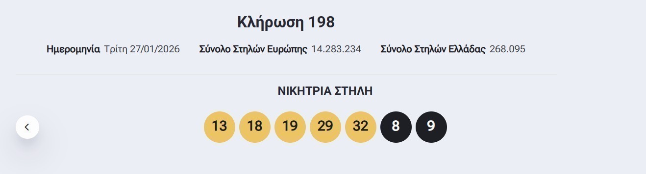 Οι τυχεροί αριθμοί που ανέδειξε η κλήρωση του Eurojackpot το βράδυ της Τρίτης, 27/1/2026 είναι οι εξής: 13, 18, 19, 29, 32 και 8, 9.