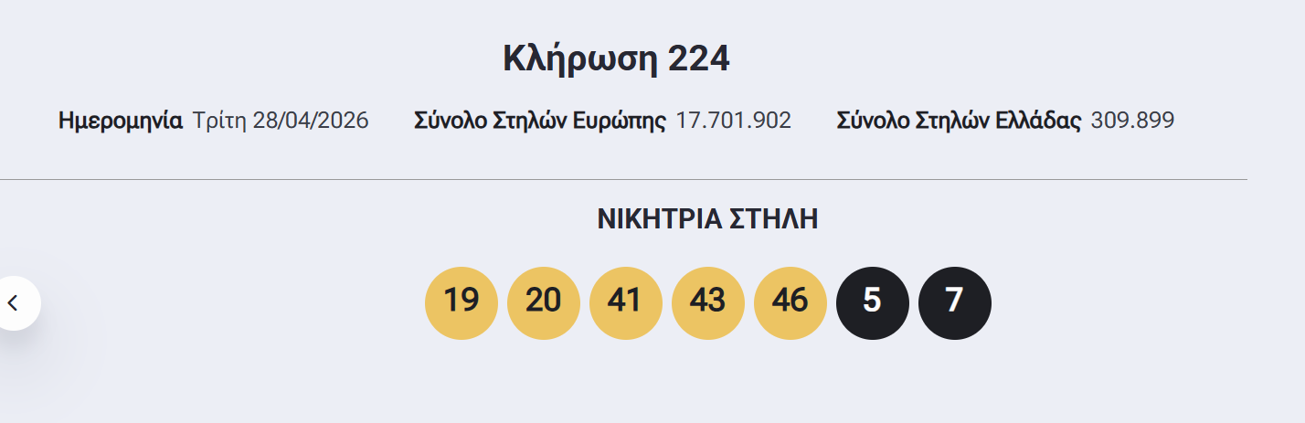 Οι τυχεροί αριθμοί που ανέδειξε η κλήρωση του Eurojackpot το βράδυ της Τρίτης, 28/4/2026 είναι οι εξής: 19, 20, 41, 43, 46 και 5, 7.