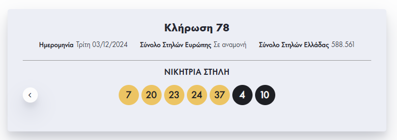 Οι τυχεροί αριθμοί που ανέδειξε η κλήρωση του Eurojackpot το βράδυ της Τρίτης 3/12/2024 είναι οι εξής: 7, 20, 23, 24, 37, 4, 10