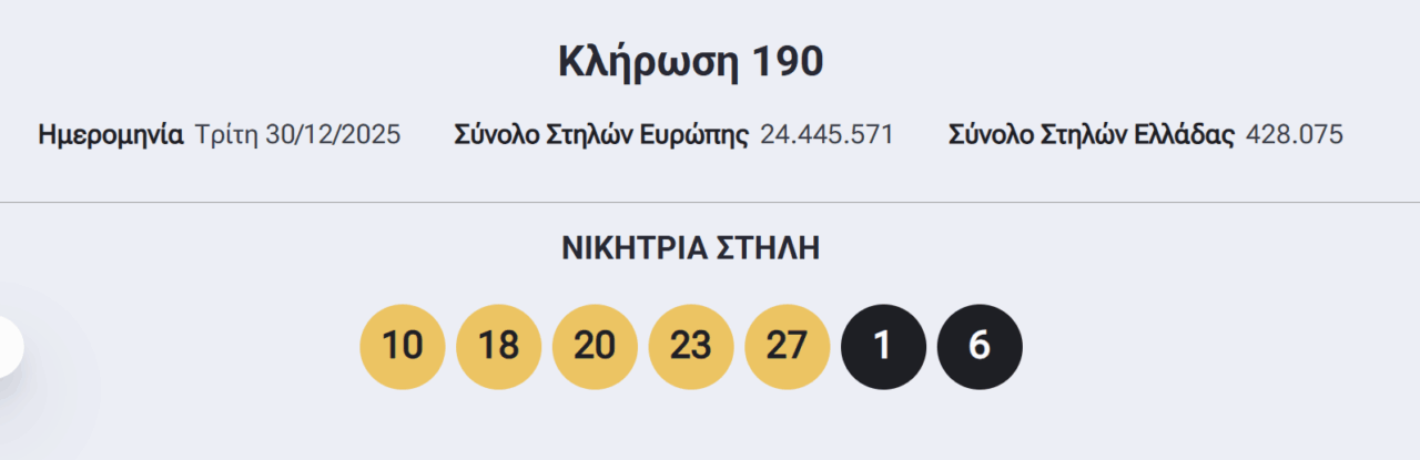 Οι τυχεροί αριθμοί που ανέδειξε η κλήρωση του Eurojackpot το βράδυ της Τρίτης, 30/12/2025 είναι οι εξής: 10, 18, 20, 23, 27 και 1, 6.
