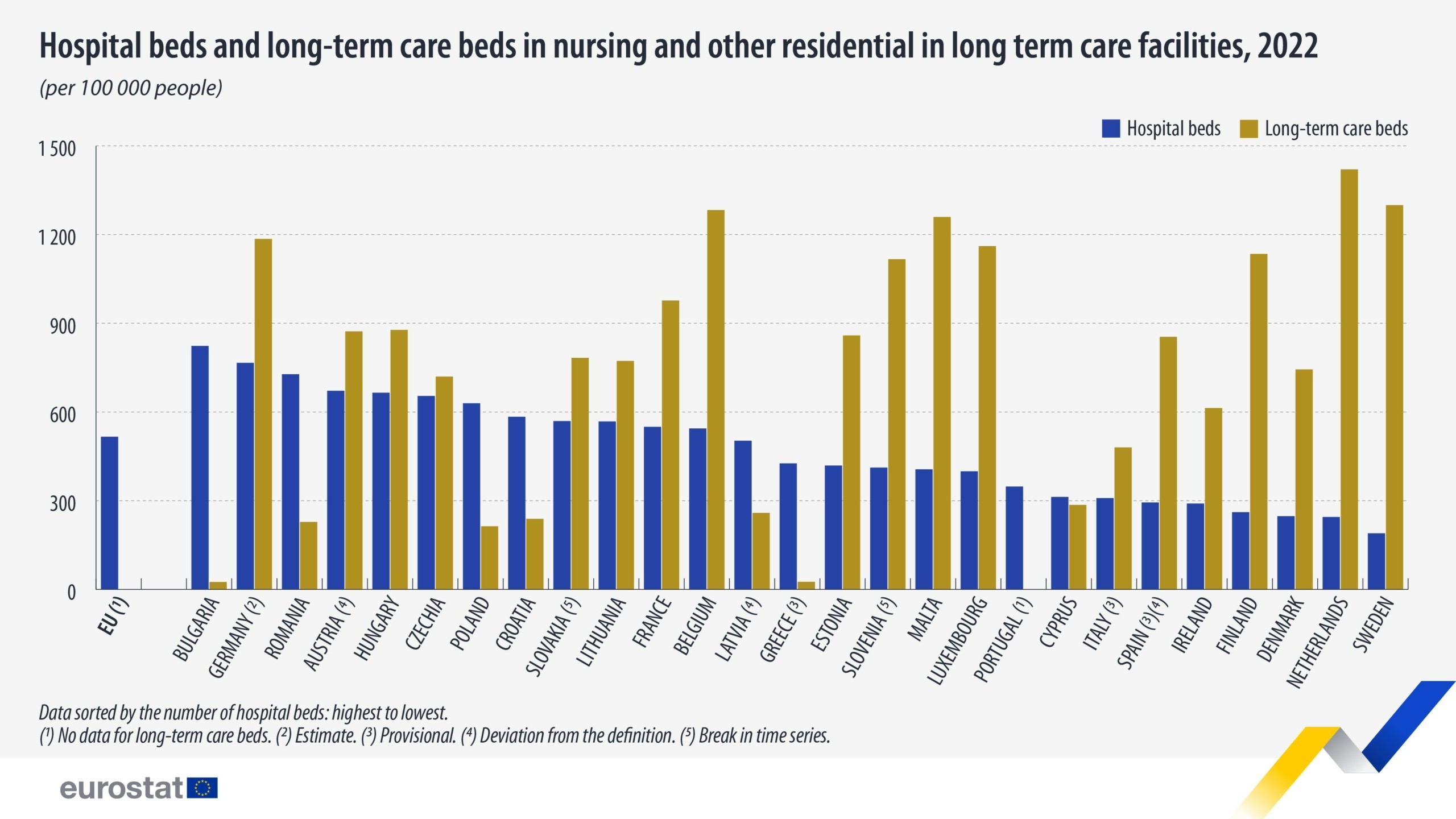 Όσον αφορά τις κλίνες μακροχρόνιας περίθαλψης σε νοσηλευτικές και άλλες οικιακές εγκαταστάσεις μακροχρόνιας φροντίδας, το 2022, τα υψηλότερα ποσοστά καταγράφηκαν στην Ολλανδία (1.420 κρεβάτια μακροχρόνιας φροντίδας ανά 100.000 άτομα), στη Σουηδία (1.299) και στο Βέλγιο (1.283).