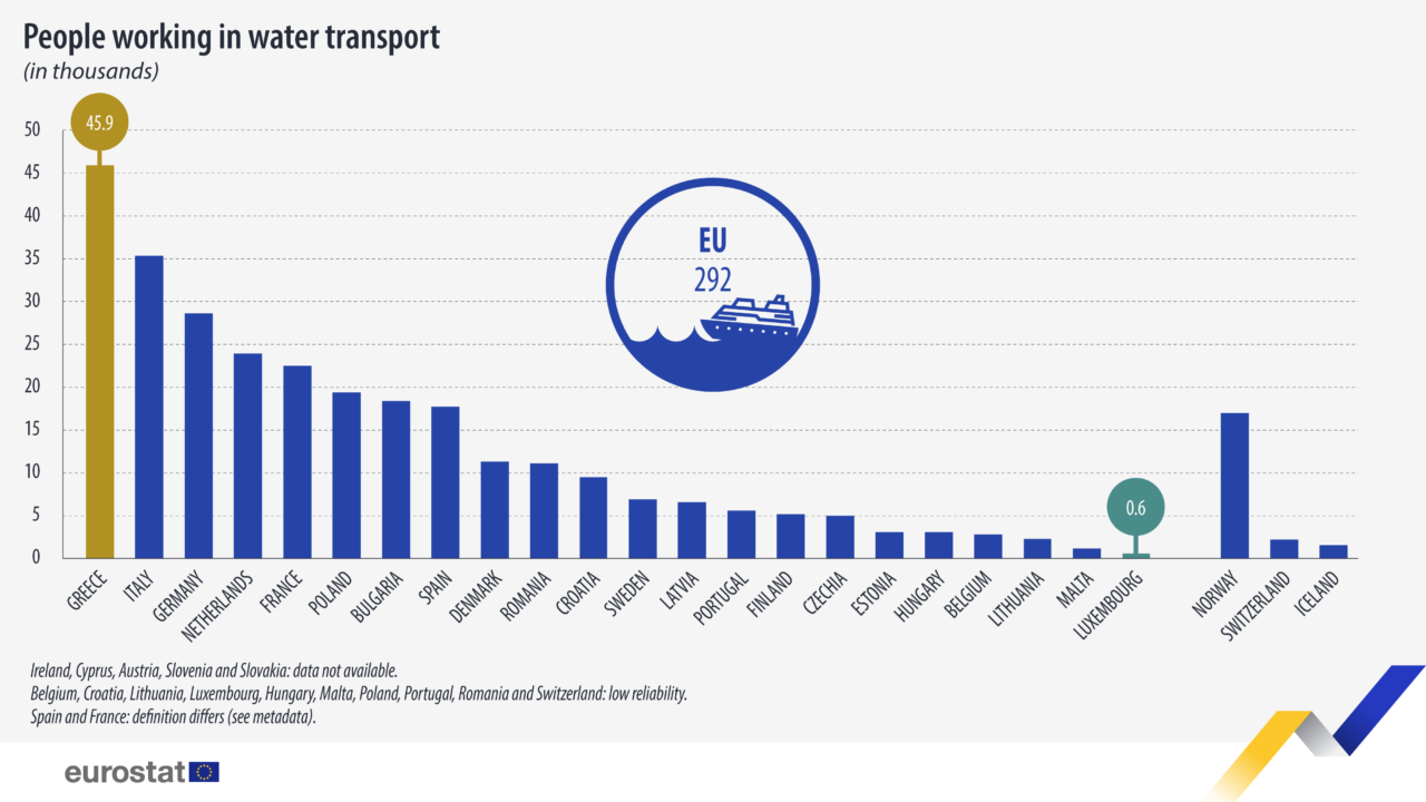 Μεταξύ των χωρών της ΕΕ, ο μεγαλύτερος αριθμός εργαζομένων στις θαλάσσιες μεταφορές καταγράφηκε στην Ελλάδα (45 900 άτομα- 16% της συνολικής απασχόλησης στις θαλάσσιες μεταφορές στην ΕΕ), ακολουθούμενη από την Ιταλία (35 300 άτομα- 12%) και τη Γερμανία (28 600 άτομα- 10%).