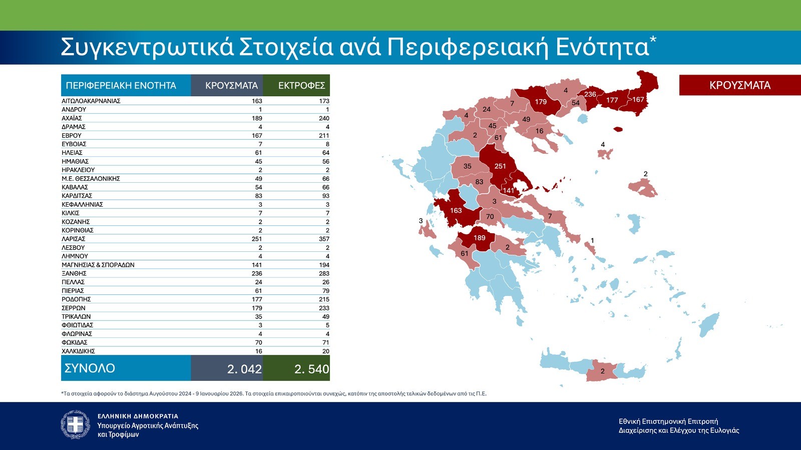 Για την περίοδο αναφοράς 20 Δεκεμβρίου 2025 – 9 Ιανουαρίου 2026 καταγράφηκαν 57 νέα κρούσματα σε 16 περιοχές, βάσει των αποτελεσμάτων των εργαστηριακών ελέγχων.