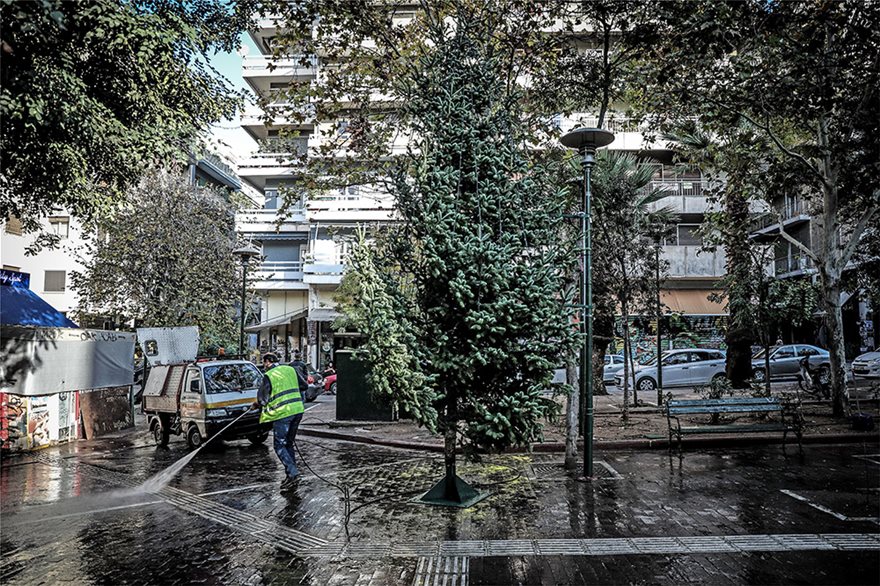 Συνεργεία του δήμου βρέθηκαν νωρίς το πρωί στα Εξάρχεια και, αφού καθάρισαν την πλατεία κι απομάκρυναν το καμένο έλατο, τοποθέτησαν ένα νέο χριστουγεννιάτικο δέντρο στο ίδιο ακριβώς σημείο.