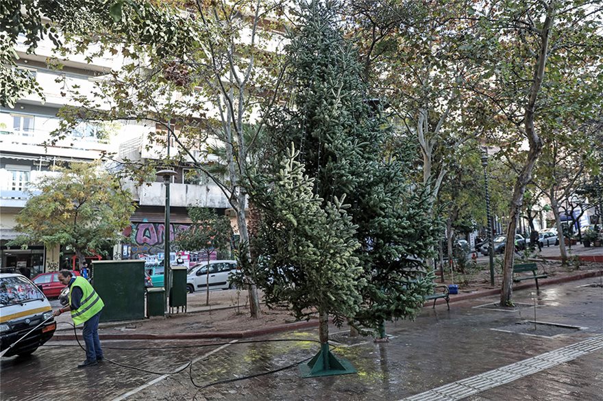 Συνεργεία του δήμου βρέθηκαν νωρίς το πρωί στα Εξάρχεια και, αφού καθάρισαν την πλατεία κι απομάκρυναν το καμένο έλατο, τοποθέτησαν ένα νέο χριστουγεννιάτικο δέντρο στο ίδιο ακριβώς σημείο.