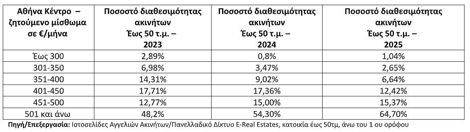 Συγκεκριμένα, στις περιοχές του κέντρου των Αθηνών, οι κατοικίες άνω του 1ου ορόφου έως 50τμ που διατίθενται με ζητούμενο μίσθωμα έως 300€, αποτελούν μόλις το 1,04% (0,8% το 2024, 2,89% το 2023, 12,47% το 2022) επί του συνόλου των διαθέσιμων προς μίσθωση κατοικιών.