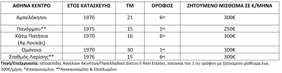 Παραδείγματα κατοικιών με ζητούμενο μίσθωμα έως 300€/μήνα στις περιοχές του κέντρου της Αθήνας