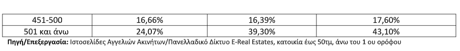 Φέτος, σχεδόν 1 στις 10 κατοικίες έχουν ζητούμενο μίσθωμα από 451€ έως 500€, γεγονός που καταδεικνύει την μικρή διαθεσιμότητα ακινήτων με οικονομικότερο ζητούμενο μίσθωμα. Το 72,66% των διαθέσιμων κατοικιών έχουν ζητούμενο μίσθωμα άνω των 501€/μήνα.