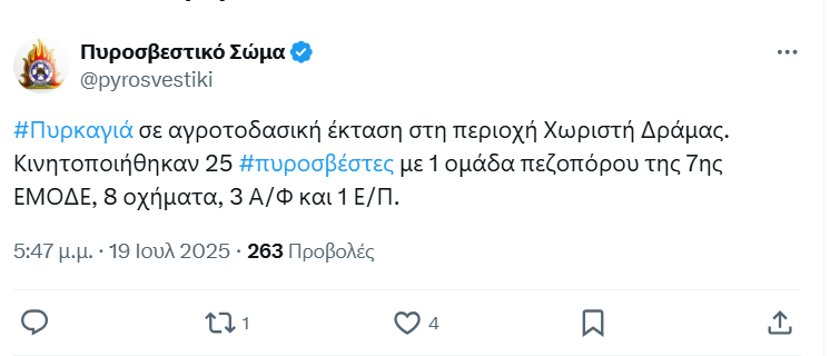 Στην περιοχή επιχειρούν 25 πυροσβέστες με οχτώ οχήματα, τρία αεροσκάφη και ένα ελικόπτερο.
