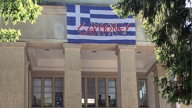 Οι καλλιτέχνες ύψωσαν την ελληνική σημαία πάνω από το γερμανικό περίπτερο και με μεγάλα κόκκινα γράμματα έγραψαν «Germoney».