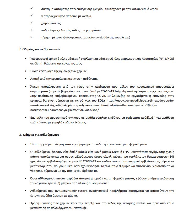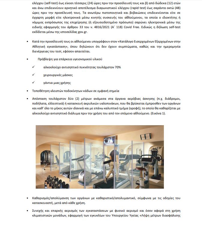 Σύμφωνα με αυτά, πρόσβαση σε γυμναστήρια, έχουν οι εμβολιασμένοι και οι έχοντες νοσήσει εντός εξαμήνου ενώ οι αθλούμενοι που είναι ανεμβολίαστοι υποχρεούνται σε ένα PCR ή rapid test μία φορά την εβδομάδα. Στο πλαίσιο αυτό θα γίνεται ο έλεγχος βεβαίωσης εμβολιασμού, νόσησης, αρνητικού τεστ και έλεγχος ταυτοπροσωπίας στην είσοδο της επιχείρησης με την εφαρμογή covid free app.