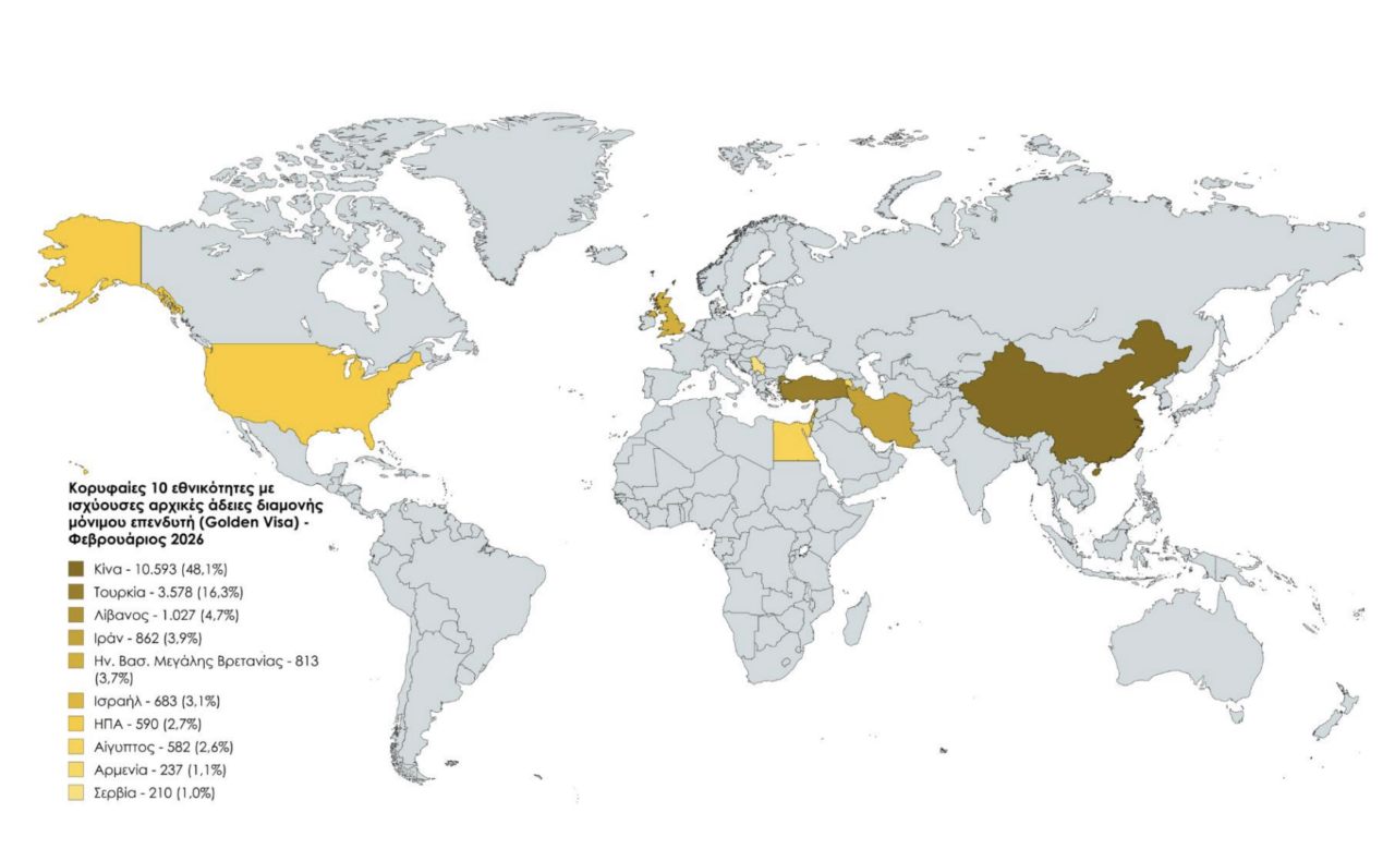 Επισημαίνεται εδώ ότι με βάση τα στοιχεία του υπουργείου Μετανάστευσης έως και το Φεβρουάριο του 2026, η εθνικότητα με τις περισσότερες αρχικές άδειες μόνιμου επενδυτή παραμένει μακράν η Κίνα (48,1%) με 10.593 αρχικές άδειες διαμονής μόνιμου επενδυτή και ακολουθούν Τουρκία (16.3%) με 3.578, Λίβανος (4,7%), Ιράν (3,9%), Ηνωμένο Βασίλειο (3,7%), Ισραήλ (3,1%), ΗΠΑ (2,7%), Αίγυπτος (2,6%), Αρμενία (1,1%) και Σερβία (1%).