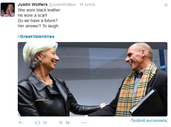 Δημοσιογράφοι, οικονομολόγοι και γενικότερα χρήστες του Twitter “γιορτάζουν” τον Άγιο Βαλεντίνο… αλά ελληνικά με το hashtag #GreekValentines, φτιάχνοντας στίχους για τις ελληνικές διαπραγματεύσεις, το Eurogroup, το κασκόλ του Γιάννη Βαρουφάκη, καταφέροντας μάλιστα να κάνουν ρίμα ακόμα και με το όνομα του προέδρου του Eurgroup, Γερούν Ντάισελμπλουμ.