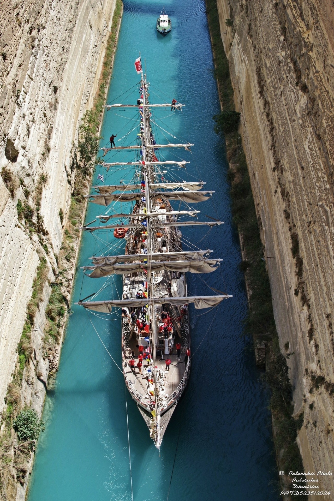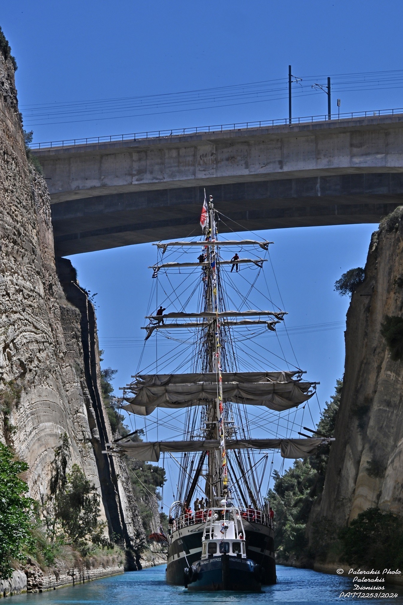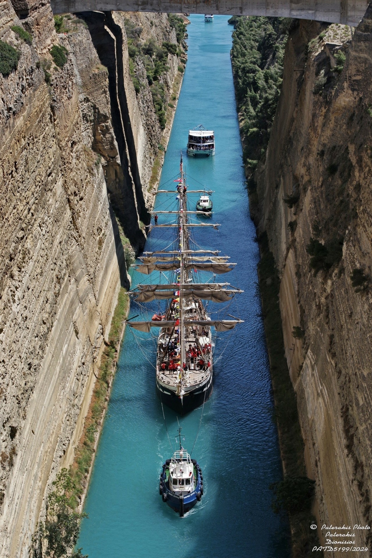 Το m/v Belem συνόδευσε Γαλλικό Πολεμικό Πλοίο μέχρι την Ανατολική Είσοδο της Διώρυγας Κορίνθου στα Ίσθμια. Από εκεί, το τρικάταρτο ιστιοφόρο διένυσε τη θαλάσσια οδό της Διώρυγας Κορίνθου από τον Σαρωνικό στον Κορινθιακό κόλπο, συνολικού μήκους 6.300 μέτρων, συνοδευόμενο από Ρυμουλκό και Πλοηγίδα της Ανωνύμου Εταιρείας Διώρυγος Κορίνθου (Α.Ε.ΔΙ.Κ) μέχρι την έξοδο από την Διώρυγα στον Κορινθιακό Κόλπο, στην Αρχαία Δίολκο.
