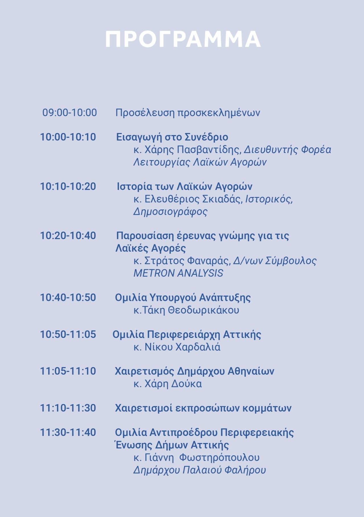 Το πρώτο συνέδριο στα 96 χρόνια λειτουργίας των Λαϊκών Αγορών, οργανώνεται από τον Φορέα Λειτουργίας Λαϊκών Αγορών της Περιφέρειας Αττικής και θα πραγματοποιηθεί την Κυριακή 1η Ιουνίου στο ξενοδοχείο Titania, με θέμα «Το παρόν και τον μέλλον των Λαϊκών Αγορών».