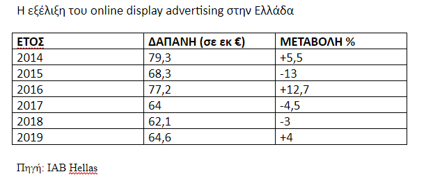 Ενδείξεις βελτίωσης και ανάσχεσης της αρνητικής μεταβολής του προηγούμενου έτους αποτυπώνει το 2019 η display διαφήμιση στην Ελλάδα, καταγράφοντας αύξηση της τάξεως του 4% έναντι του 2018 οπότε η δαπάνη είχε αρνητικό πρόσημο (-3%) σε σχέση με το 2017. Σε επίπεδο απόλυτων αριθμών, η display δαπάνη επιστρέφει το 2019 στις επιδόσεις του 2017 καθώς διαμορφώνεται στα 64,6 εκατ. ευρώ έναντι 62,1 εκατ. ευρώ το 2018.