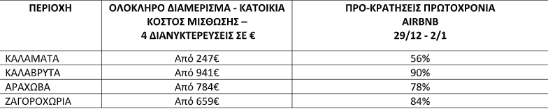 Στα Καλάβρυτα, οι προ-κρατήσεις αγγίζουν το 90%, με ζητούμενες τιμές από 941€ για κατοικία με 2 Υ/Δ κατάλληλη για 6-8 άτομα.