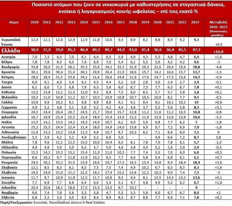 Σύμφωνα με την Eurostat, στην Ελλάδα το 47,3% (2022:45,5%) των ατόμων ζουν σε νοικοκυριά με καθυστερήσεις σε στεγαστικά δάνεια, ενοίκια ή λογαριασμούς κοινής ωφελείας, που αποτελεί το μεγαλύτερο ποσοστό στο σύνολο των 29 χωρών της Ε.Ε., όταν το μέσο ποσοστό στην Ευρωπαϊκή Ένωση είναι 9,3%. Δηλαδή, περίπου ο μισός πληθυσμός της χώρας μας ζει σε νοικοκυριά που έχουν καθυστερήσεις σε έξοδα που είναι άμεσα σχετιζόμενα με τη στέγαση.
