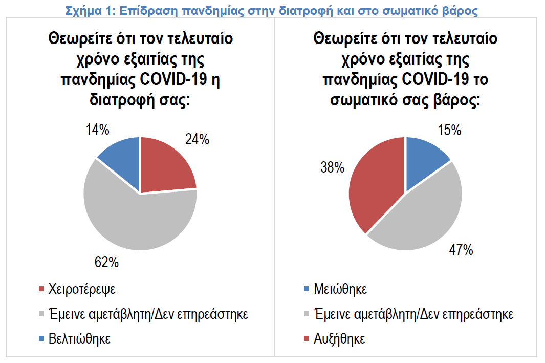 Στην έρευνα καταγράφεται σαφώς μία σημαντική επίδραση της πανδημίας και συγκεκριμένα των μέτρων περιορισμού κυκλοφορίας και της παραμονής στο σπίτι στην διατροφή των καταναλωτών και στο σωματικό τους βάρος. Το 38% των καταναλωτών δηλώνουν ότι την χρονιά που πέρασε αυξήθηκε το σωματικό τους βάρος, ενώ μόλις ένα 15% ότι μειώθηκε. Παράλληλα, 24% δηλώνει ότι την χρονιά που πέρασε χειροτέρεψε η διατροφή τους, ενώ ένα 14% ότι βελτιώθηκε. Τα αποτελέσματα δείχνουν ότι για τις διατροφικές συνήθειες της πανδημίας, το «ισοζύγιο θετικών και αρνητικών» επιδράσεων, τείνει προς αρνητικό πρόσημο. Παρότι κατά τη διάρκεια των lockdown συνήθειες όπως η μαγειρική στο σπίτι επέδρασσαν θετικά στο κομμάτι της διατροφής, άλλοι παράγοντες όπως η αύξηση των παραγγελιών έτοιμου φαγητού και η έλλειψη σωματικής άσκησης αντιστάθμισαν τα όποια οφέλη. Επομένως πέρα την επιστροφή στην κανονικότητα σε σχέση με τις αγοραστικές συνήθειες, πλέον βλέπουμε και την αρχή μίας μακράς διάρκειας διαδικασίας επιστροφής στην κανονικότητα και για τις διατροφικές συνήθειες.