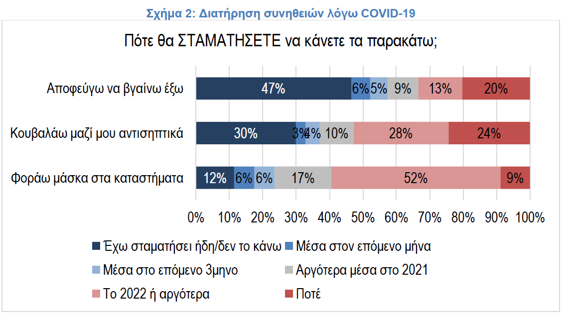 Σύμφωνα με την έρευνα, η επιστροφή στην κανονικότητα σε σχέση με τις αγοραστικές συνήθειες είναι δεδομένο ότι θα διαρκέσει αρκετά μεγάλο χρονικό διάστημα. Μία σειρά από συνηθειών που υιοθετήθηκαν λόγω της εμφάνισης της κρίσης του COVID-19 αναμένεται να διατηρηθούν από μεγάλες ομάδες των καταναλωτών ακόμα και το 2022 (ή και να μην σταματήσουν ποτέ).