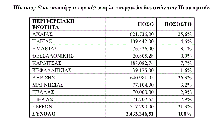 Τα παραπάνω ποσά καταβλήθηκαν από το ΥΠΑΑΤ στις Περιφέρειες, σύμφωνα με τα στοιχεία που υπέβαλαν σχετικά με τις λειτουργικές τους δαπάνες.