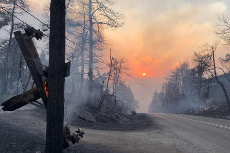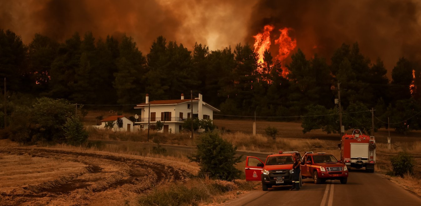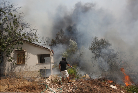Κυκλωμένο από τις φλόγες παραμένει το χωριό Ελληνικά. Πυροσβέστες και κάτοικοι, που έχουν απομείνει εκεί μετά την εκκένωση του, κάνουν απελπισμένες προσπάθειες να σώσουν ό,τι μπορούν.