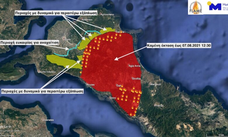 Ο παραπάνω χάρτης της επιχειρησιακής μονάδας ΜΕΤΕΟ του Εθνικού Αστεροσκοπείου Αθηνών (ΕΑΑ) απεικονίζει την έκταση των καμένων στη Βόρεια Εύβοια την 7η Αυγούστου και μια πιλοτική εκτίμηση για την εξάπλωση της δασικής πυρκαγιάς που μαίνεται στη βόρεια Εύβοια