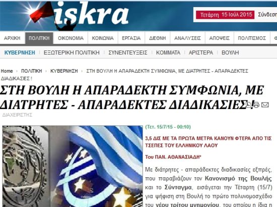 Μετά τη σκληρή ανακοίνωση από τον υπουργό Ενέργειας, Παναγιώτη Λαφαζάνη, προς τον Αλέξη Τσίπρα όπου του ζητούσε να πάρει πίσω τη συμφωνία έστω και στο και πέντε, ο κ. Λαφαζάνης συνεχίζει να εκφράζει την πλήρη του άρνηση να ψηφίσει απόψε στη Βουλή το νομοσχέδιο. Στο iskra μάλιστα δημοσιεύθηκε άρθρο με τίτλο: «Στη Βουλή η απαράδεκτη συμφωνία, με διάτρητες – απαράδεκτες διαδικασίες».