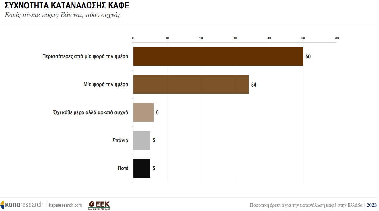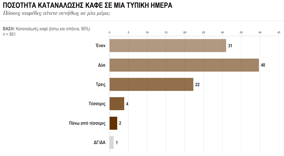 Οι μισοί από όσους δηλώνουν ότι πίνουν καθημερινά καφέ, είναι… θεριακλήδες, καθώς καταναλώνουν περισσότερους από έναν καφέ την ημέρα (2 ή 3).