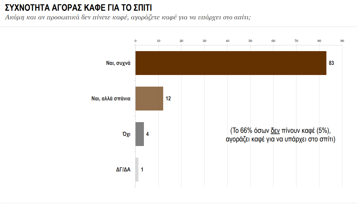 Ακόμη, δε, και από εκείνους που δεν πίνουν καφέ, που είναι μόλις το 5% των ερωτηθέντων, οι περισσότεροι, ποσοστό 66%, φροντίζουν να εφοδιάζουν το νοικοκυριό τους.