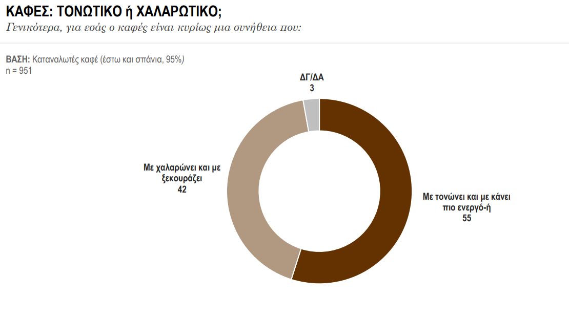 Ενδιαφέρον παρουσιάζουν και οι λόγοι για τους οποίους οι Έλληνες δηλώνουν ότι πίνουν καφέ: Περισσότεροι από τους μισούς, ποσοστό 55%, νιώθουν ότι τους τονώνει, ενώ περισσότεροι από 4 στους μ10 (ποσοστό 42%) ότι τους χαλαρώνει και τους ξεκουράζει.