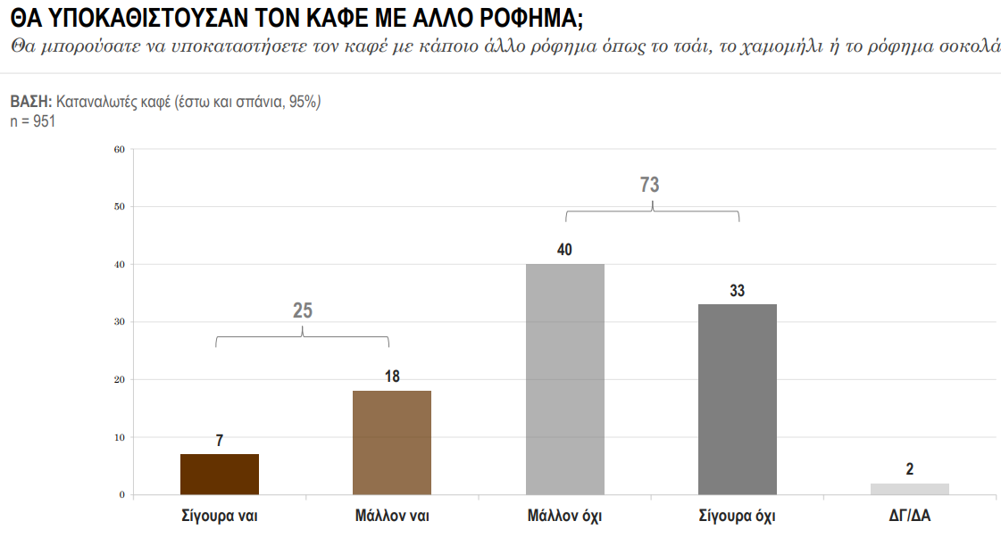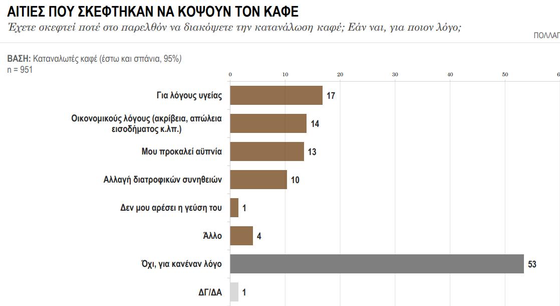 Είναι χαρακτηριστικό ότι το 53% των ερωτηθέντων δεν έχει σκεφτεί ποτέ να κόψει τον καφέ. Ωστόσο, ένα ποσοστό 17% θα το έκανε για λόγους υγείας, το 14% για οικονομικούς λόγους και ένα 13% επειδή ο καφές του προκαλεί αϋπνία.