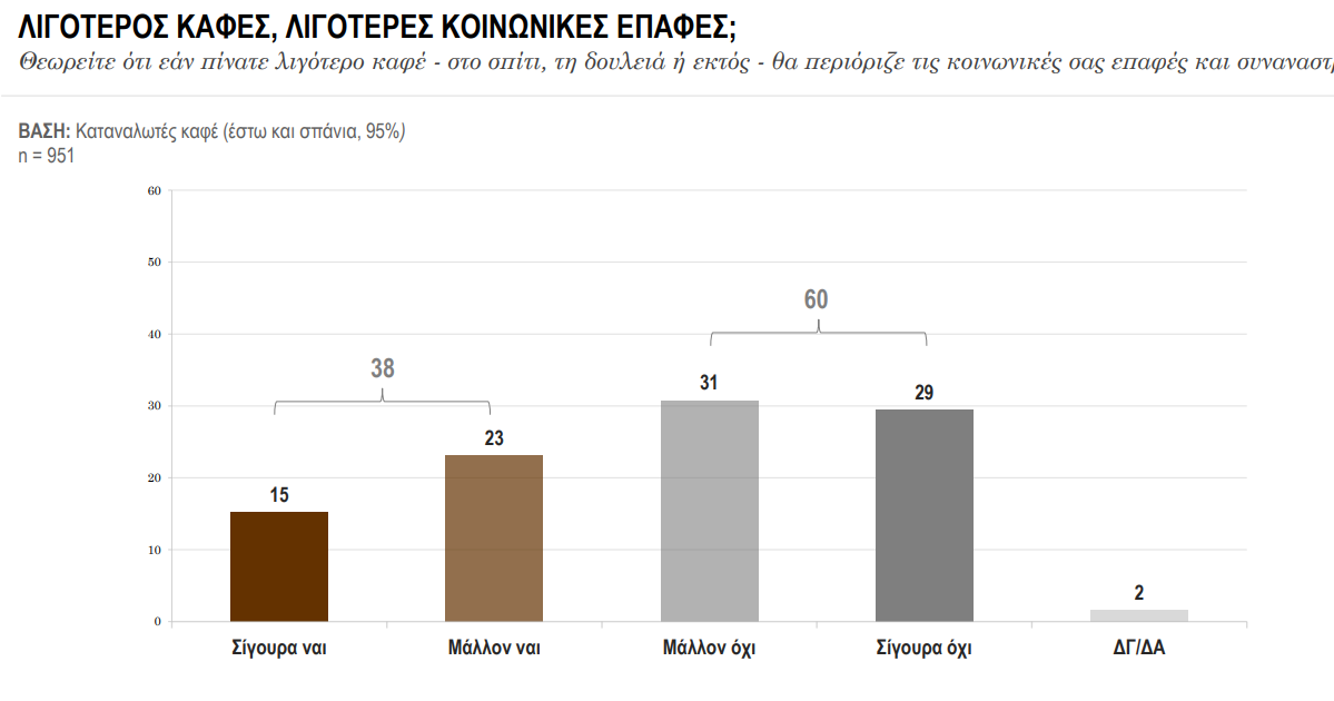 Συν τοις άλλοις για το 38% εκείνων που πίνουν καφέ, ο περιορισμός της κατανάλωσής του στο σπίτι, στη δουλειά ή και εκτός σπιτιού, είτε για οικονομικούς λόγους, είτε για άλλα αίτια, θα σήμαινε αυτομάτως και τον περιορισμό των κοινωνικών τους συναναστροφών.