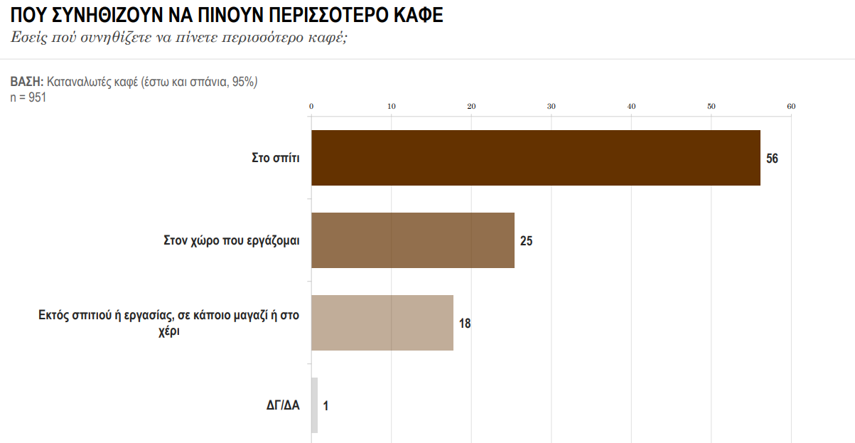 Πού πίνουμε περισσότερο καφέ; Σύμφωνα με την έρευνα, το 56% στο σπίτι και ακολουθεί με μεφάλη διαφορά ο χώρος εργασίας και τελευταία επιλογή είναι κάποιο μαγαζί ή στο χέρι.
