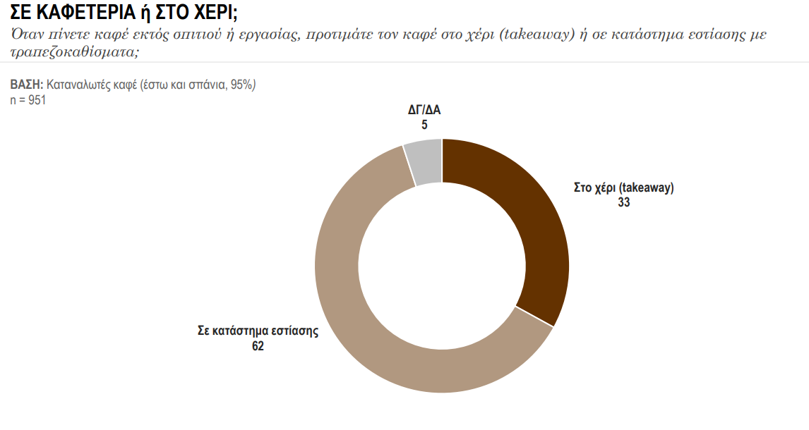 Από εκείνους οι οποίοι θα απολαύσουν το καφεδάκι τους εκτός σπιτιού ή εργασίας, το 62% προτιμά να το κάνουν καθήμενοι σε κάποιο κατάστημα εστίασης, ενώ το 33% προτιμά να τον πάρει στο χέρι (takeaway).