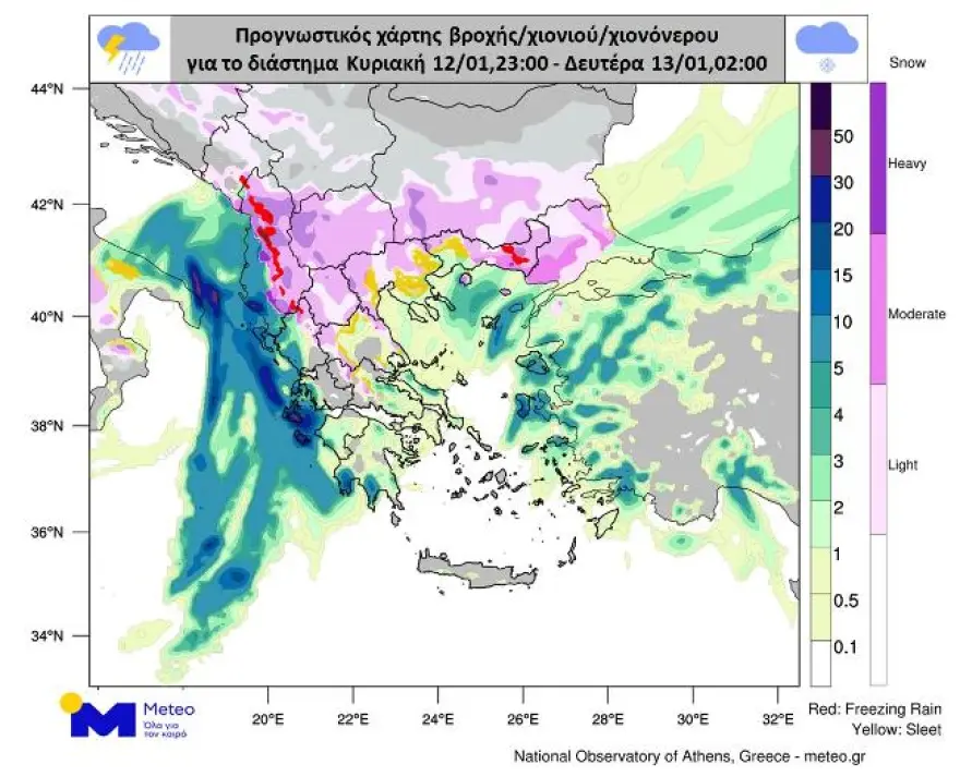 Σύμφωνα με τα προγνωστικά στοιχεία του meteo.gr / Εθνικού Αστεροσκοπείου Αθηνών, η κακοκαιρία αναμένεται να συνεχιστεί, με τις χιονοπτώσεις να επεκτείνονται κατά τόπους σε ακόμη χαμηλότερα υψόμετρα.