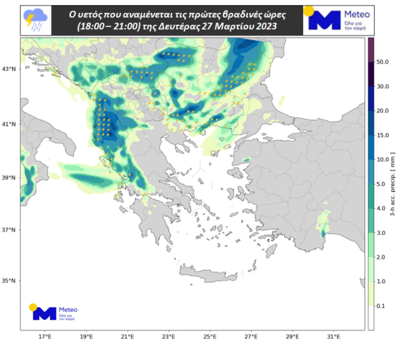 Από το μεσημέρι της Δευτέρας 27/03 αναμένονται βροχές και καταιγίδες στα βόρεια και δυτικά ηπειρωτικά (συμπεριλαμβανομένης και της Δυτικής Πελοποννήσου), στο Βόρειο Αιγαίο και στο Ιόνιο ενώ κατά τόπους οι καταιγίδες θα συνοδεύονται από χαλαζοπτώσεις.