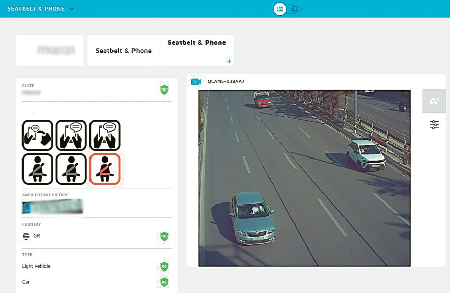 Στην κάθοδο της λεωφ. Συγγρού, το σύστημα Τεχνητής Νοημοσύνης ανιχνεύει έναν οδηγό ο οποίος δεν φορά ζώνη ασφαλείας. Τον καταγράφει, επισημαίνοντας (με κόκκινο χρώμα) το ανάλογο εικονίδιο (αριστερά)