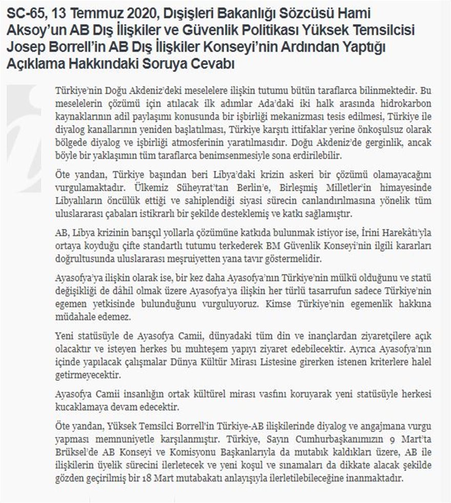Ενδεικτική των προθέσεων της Άγκυρας η ανακοίνωση του εκπροσώπου τύπου του υπουργείου Εξωτερικών της Τουρκίας Χαμί Ακσόι μετά τις ανακοινώσεις Μπορέλ τόσο για την ανατολική Μεσόγειο όσο και για την Αγία Σοφία.