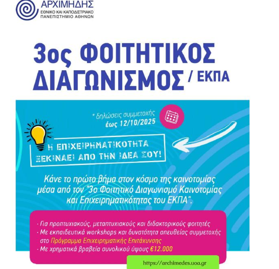 Ειδικότερα, τα μέλη της φοιτητικής κοινότητας του Εθνικού και Καποδιστριακού Πανεπιστημίου Αθηνών (ΕΚΠΑ) – προπτυχιακοί, μεταπτυχιακοί και διδακτορικοί φοιτητές – καλούνται να υποβάλουν αίτηση συμμετοχής έως τις 12/10/2025 στον 3ο Φοιτητικό Διαγωνισμό Καινοτομίας και Επιχειρηματικότητας, που διοργανώνει το Κέντρο Αρχιμήδης.