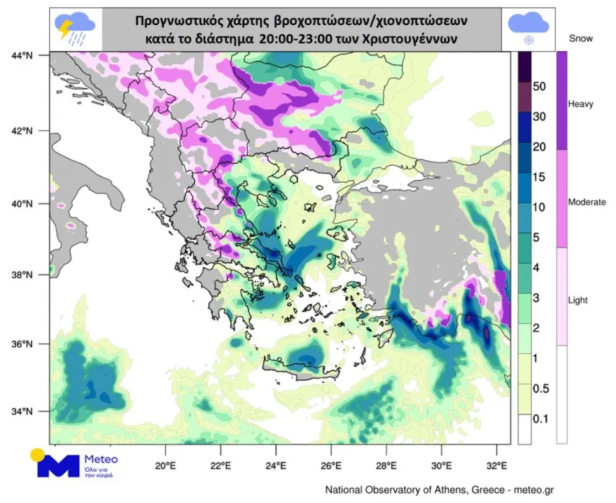 Βροχές, καταιγίδες και χιονοπτώσεις αναμένονται ανήμερα τα Χριστούγεννα αλλά και την Πέμπτη (26/12, σύμφωνα με τα προγνωστικά στοιχεία του meteo.gr/Εθνικού Αστεροσκοπείου Αθηνών.