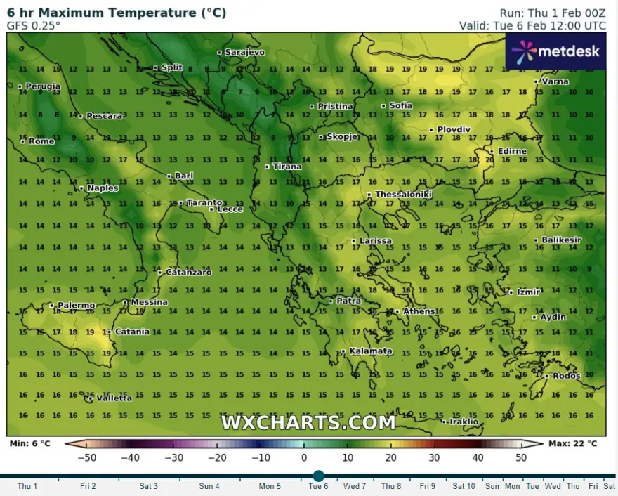 Την ερχόμενη Τρίτη 6 Φεβρουαρίου, σύμφωνα με τον Ευρωπαϊκό χάρτη κατανομής θερμοκρασιών, η θερμοκρασία, ακόμη και στα βόρεια τμήματα της χώρας, θα αγγίξουν έως και τους 17 βαθμούς Κελσίου.