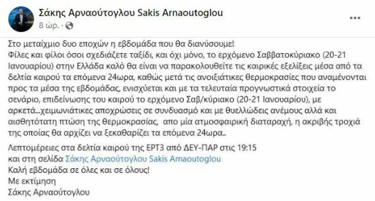 Όπως αναφέρει σε ανάρτησή του στο Facebook ο Σάκης Αρναούτογλου «ενισχύεται, σύμφωνα και με τα τελευταία προγνωστικά στοιχεία το σενάριο επιδείνωσης του καιρού το ερχόμενο Σαββακύριακο (20-21 Ιανουαρίου), με αρκετά… χειμωνιάτικες αποχρώσεις σε συνδυασμό και με θυελλώδεις ανέμους αλλά και αισθητότατη πτώση της θερμοκρασίας, από μία ατμοσφαιρική διαταραχή, η ακριβής τροχιά της οποίας θα αρχίζει να ξεκαθαρίζει τα επόμενα 24ωρα».