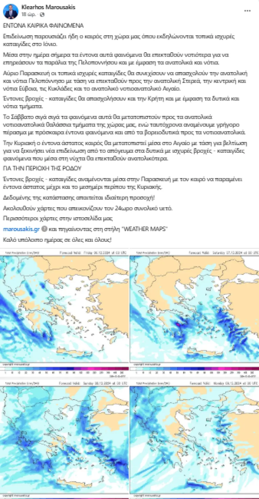 Νωρίτερα ο Κολυδάς σε ανάρτησή του για την κακοκαιρία του επόμενου διημέρου είχε γράψει: «Στις ακτές της Λιβύης βρίσκεται αύριο το πρωί τόσο το ανώτερο χαμηλό στα 500hPa, όσο και το επιφανειακό χαμηλό, όπως διακρίνουμε στον πρώτο χάρτη. Ο πολικός αεροχείμαρρος (jet stream) έχει μεταφέρει αρκετά νότια τις ασταθείς αέριες μάζες, οι οποίες περνάνε μέσα στο Σάββατο νοτίως της Κρήτης. Οι βροχοπτώσεις το επόμενο διήμερο θα είναι κατά διαστήματα πιο έντονες στα δυτικά τα κεντρικά και τα νότια θαλάσσια και παραθαλάσσια τμήματα, χωρίς όμως με ιδιαίτερα μεγάλα ύψη υετού. Τα περισσότερα φαινόμενα προβλέπονται από το μεσημέρι της Παρασκευής έως το μεσημέρι του Σαββάτου. Σημειώνουμε ότι μέσα στις περιοχές που θα επηρεαστούν συμπεριλαμβάνεται και η περιοχή της Ρόδου, όπου η χρονική διάρκεια εκδήλωσης των φαινομένων θα είναι μεγάλη και θα επικρατούν ΝΑ άνεμοι».