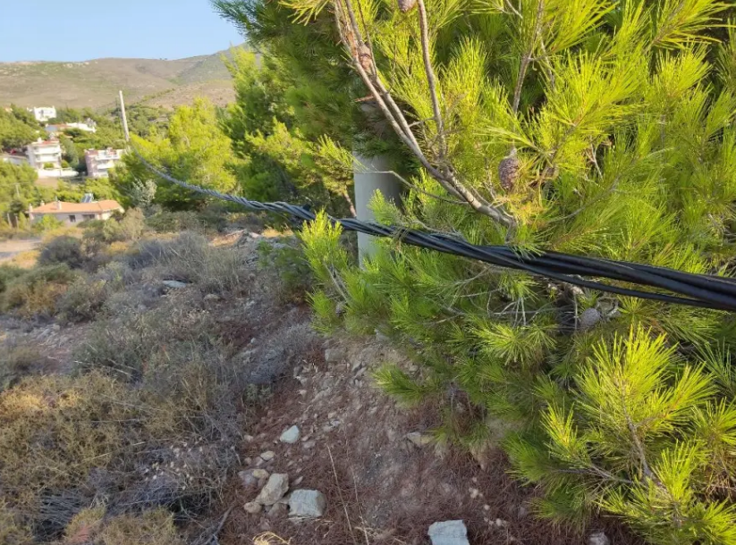 Και πιθανά η νέα πυρκαγιά στην Ανατολική Αττική θα ξεκινήσει από πάροδο της οδού Γλαύκα του οικισμού της Διώνης, καθώς εδώ και καιρό, πλεξούδα ηλεκτροφόρων καλωδίων της ΔΕΗ έχουν ξεκολλήσει από κολώνα και αιωρούνται μέσα σε πευκόφυτη περιοχή σε απόσταση λιγότερο από ένα μέτρο από το έδαφος.