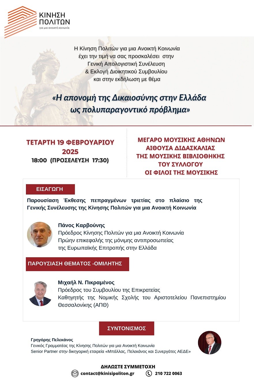 Η «Κίνηση Πολιτών για μια Ανοιχτή Κοινωνία» διοργανώνει στις 19 Φεβρουαρίου 2025 εκδήλωση με θέμα: «Η απονομή της Δικαιοσύνης στην Ελλάδα ως πολυπαραγοντικό πρόβλημα».